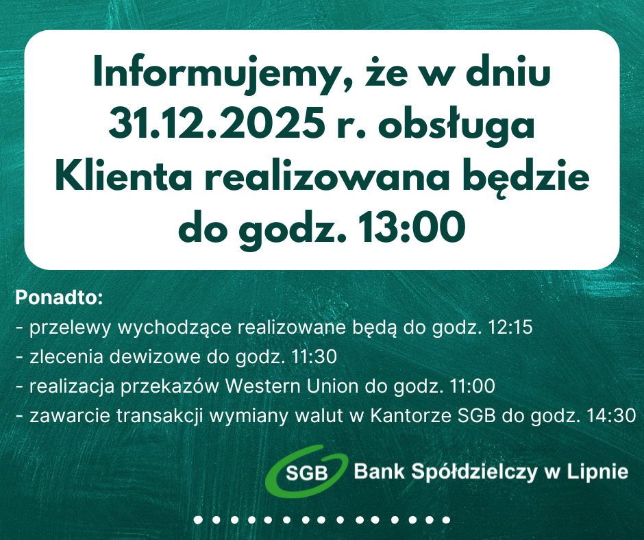 Wyrażam zgodę na przetwarzanie moich danych osobowych zgodnie z rozporządzeniem o ochronie danych osobowych w związku z wysłaniem zapytania przez formularz kontaktowy. Podanie danych jest dobrowolne, ale niezbędne do przetworzenia zapytania. Zostałem /am poinformowany /a, że przysługuje mi prawo dostępu do swoich danych, możliwości ich poprawiania, żądania zaprzestania ich przetwarzania. Administratorem danych osobowych jest Bank Spółdzielczy w Lipnie z siedzibą – 87-600 Lipno, ul. Włocławska 20B (Polityka prywatności)
