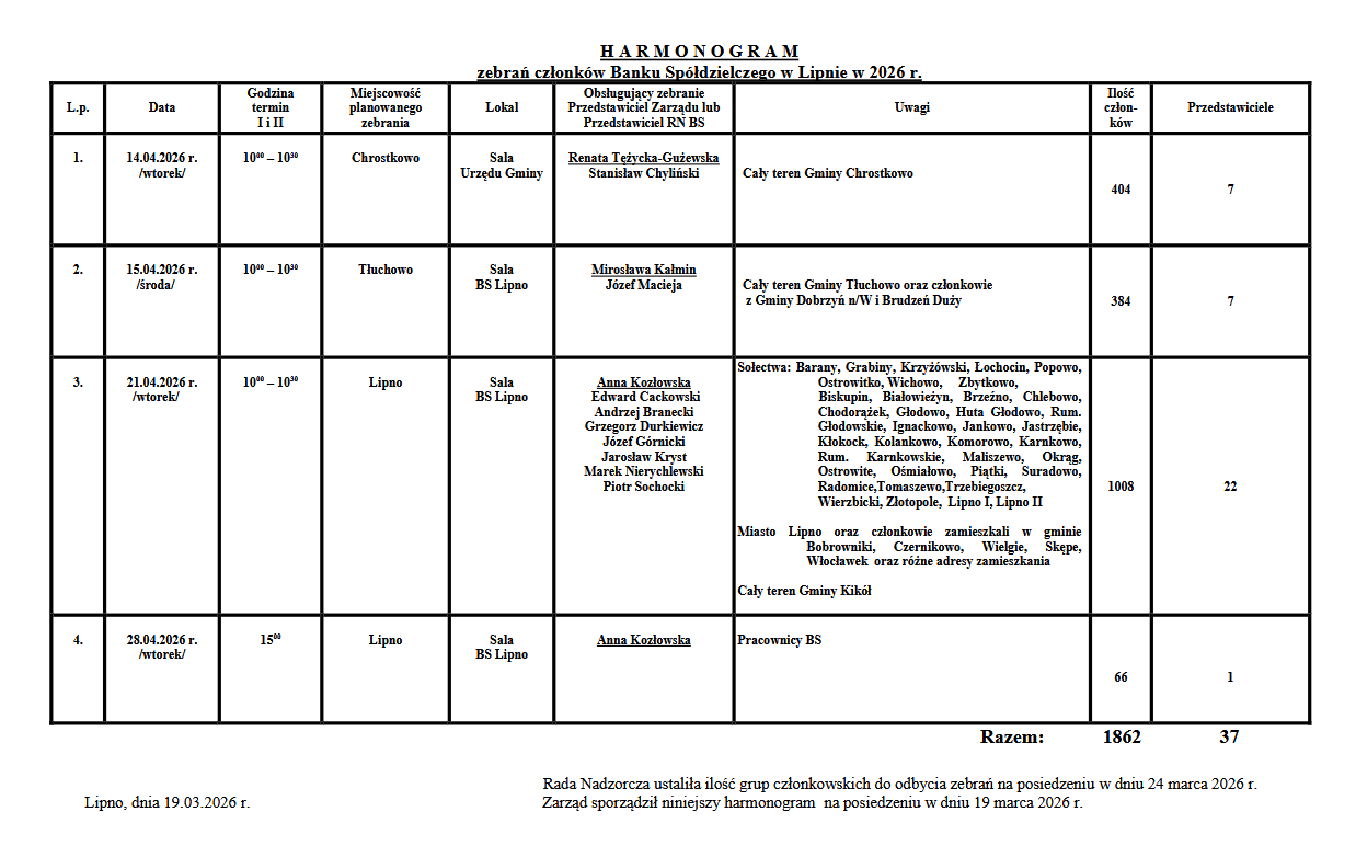 Zarząd Banku Spółdzielczego w Lipnie zwołuje Zebrania Grup Członkowskich Banku Spółdzielczego w Lipnie na dni 14 - 28 kwietnia 2026 roku, zgodnie z poniższym harmonogramem zebrań członków Banku Spółdzielczego w Lipnie w 2026 r.